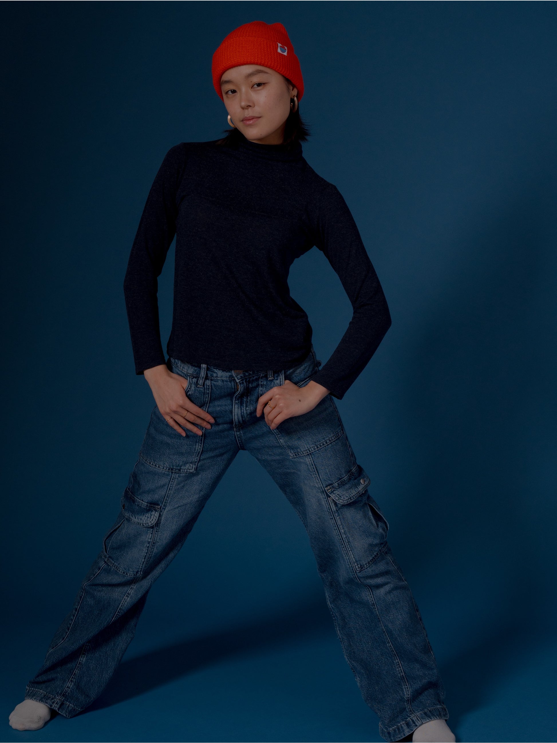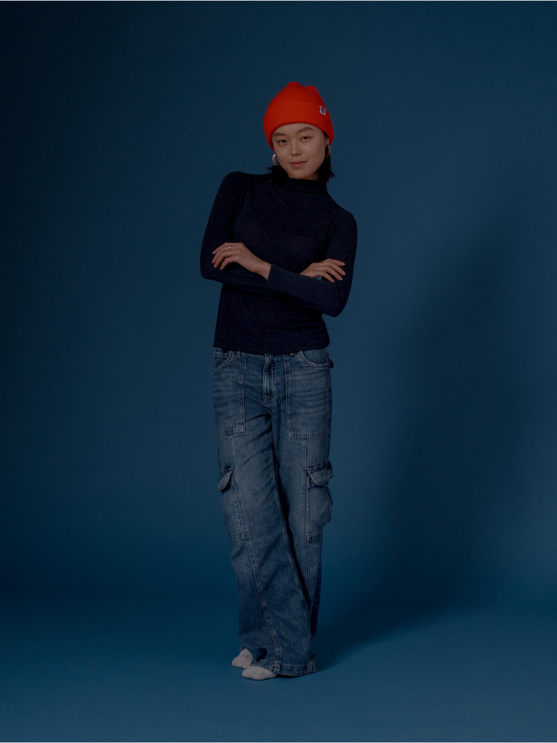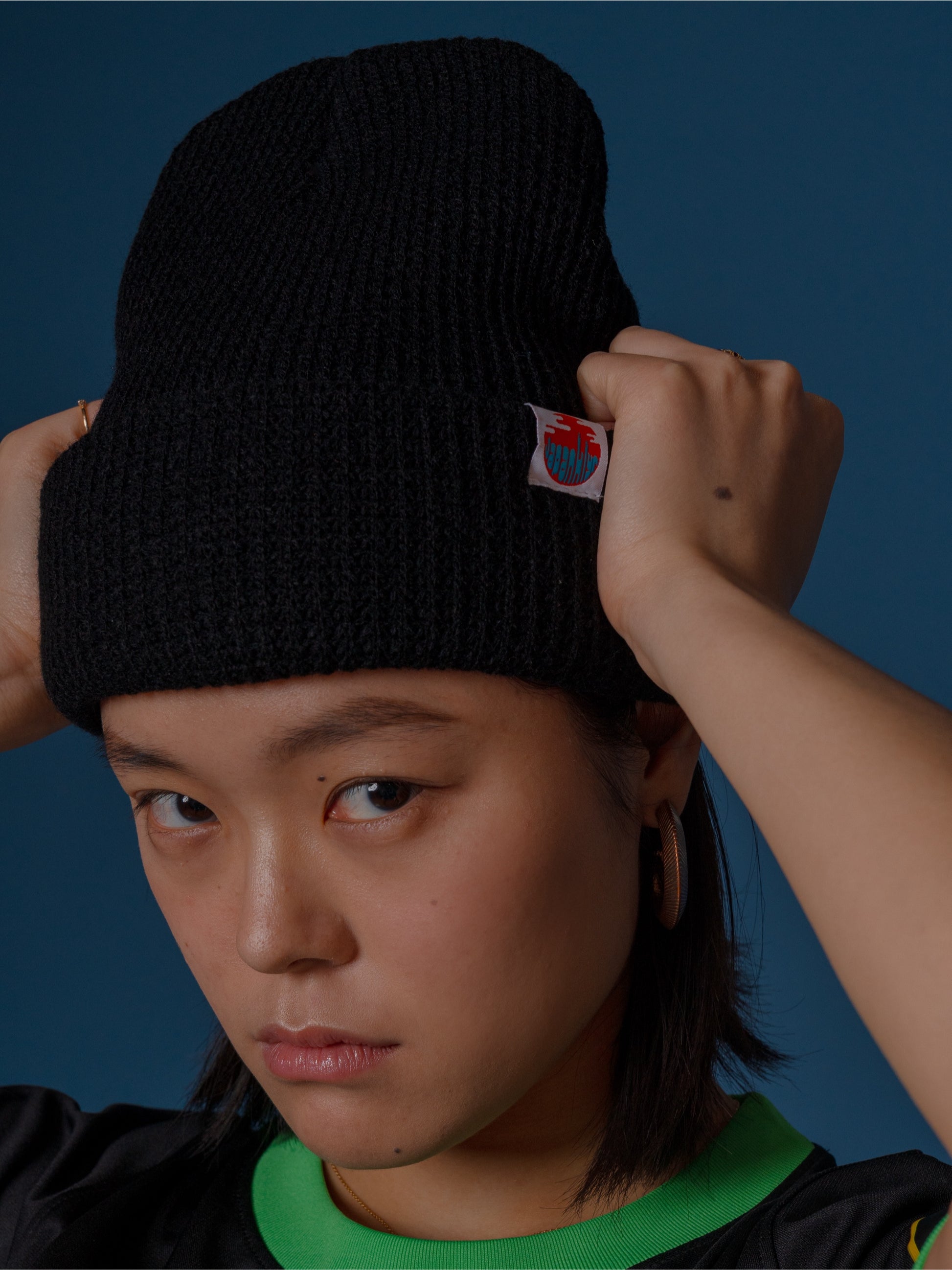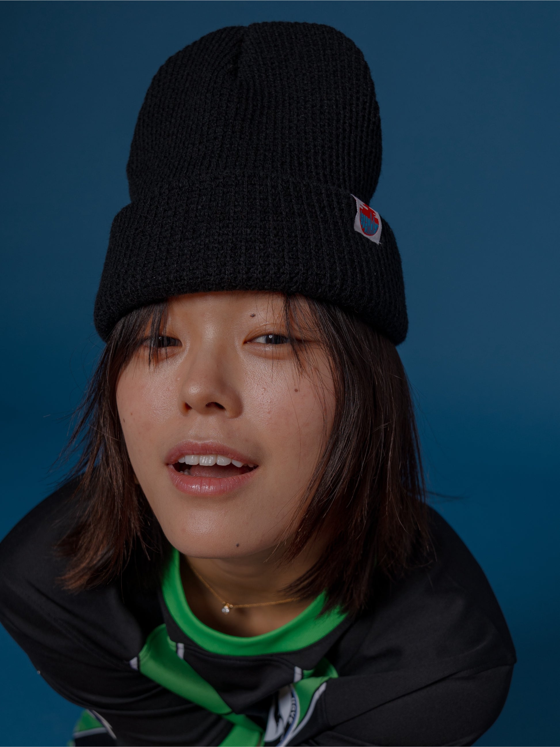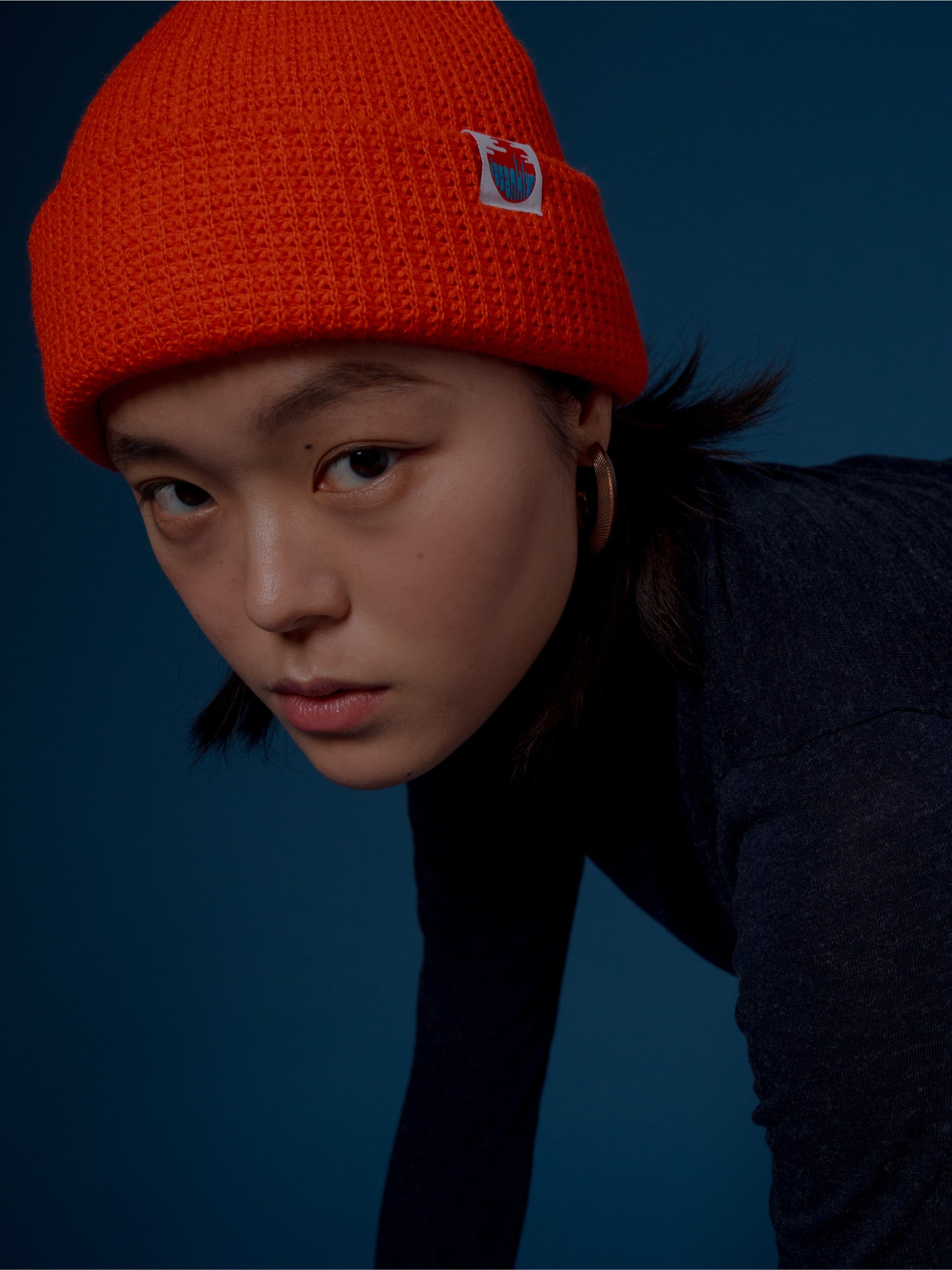 A waffle knit beanie made from acrylic wool. Finished with a classic folded cuff and a woven label at cuff edge.